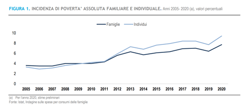 Dalle prime stime 2020, l’Istat ha colto lo smarrimento delle persone che hanno visto azzerare le proprie risorse economiche e deteriorare parte del sistema produttivo. Da qui l’ente ha fotografato una crescita esponenziale dell’incidenza della povertà assoluta per famiglie e singoli individui rispetto alla ripartizione Nord, Centro e Sud Italia.