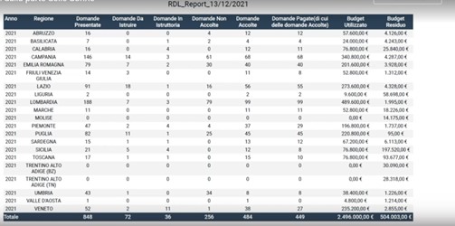 Al 13 dicembre 2021 sono pervenute all’Inps un totale di 848 domande, di cui 72 da istruire, 36 in istruttoria, 256 non accolte che per problemi legati all’Iban possono essere riprocessate, accolte 484, pagate 449 per un budget totale di 2 milioni e 496 mila euro. La situazione sul territorio nazionale è diversificata: si passa da 188 domande della Lombardia alle 146 della Campania, 82 della Puglia, 43 dell’Umbria e 91 del Lazio. Questi dati conclude Sciarrino testimoniano la gravità della situazione e l’istituzione opera per un obbiettivo comune.