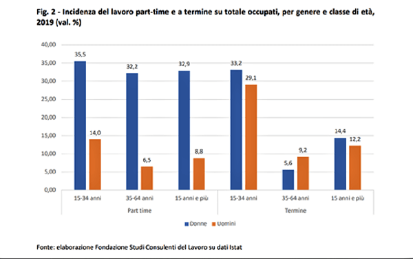 La maggiore contrazione del lavoro femminile si registra nell’occupazione a tempo determinato (-327 mila lavoratrici, un calo del 22,7%), nel lavoro autonomo (- 5,1%), nel part-time (-7,4%) e nel settore dei servizi, soprattutto ricettivi e ristorativi dove le donne rappresentano il 50,6% del totale e assistenza domestica, qui la componente femminile rappresentata l’88,1%.