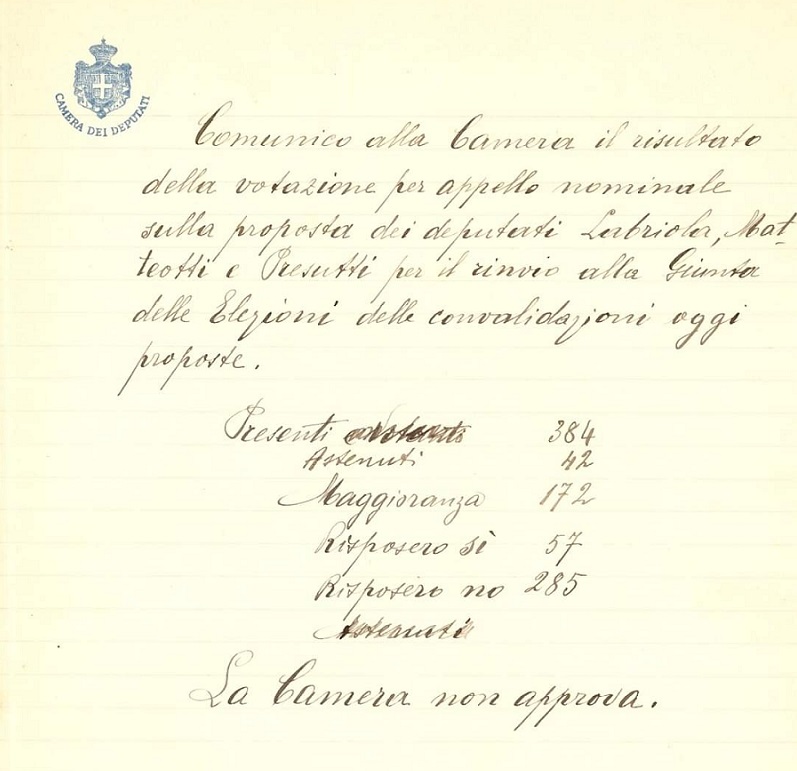 In memoria di Giacomo Matteotti, scranno da lui occupato non sarà più assegnato ad alcun deputato
